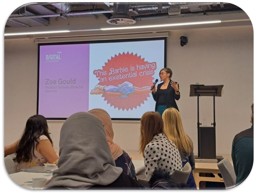 - The first talk was by Zoe Gould of Deloitte Digital. It was an excellent way to kick off the event with a nod to the hit Barbie film (existential crisis Barbie that is) and how we could all relate to feeling that way at one point or another. Pressing further as we enjoyed our croissants and coffees to say that it’s okay to make mistakes and we should give ourselves more grace and embrace the learning opportunities they present. It sparked some very interesting conversations about how we all could be kinder to ourselves in those moments and how that would impact positively in the workplace for ourselves and for others.